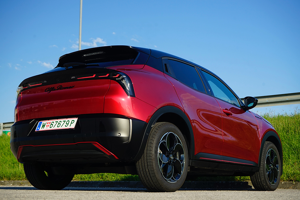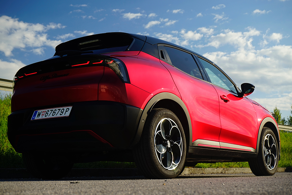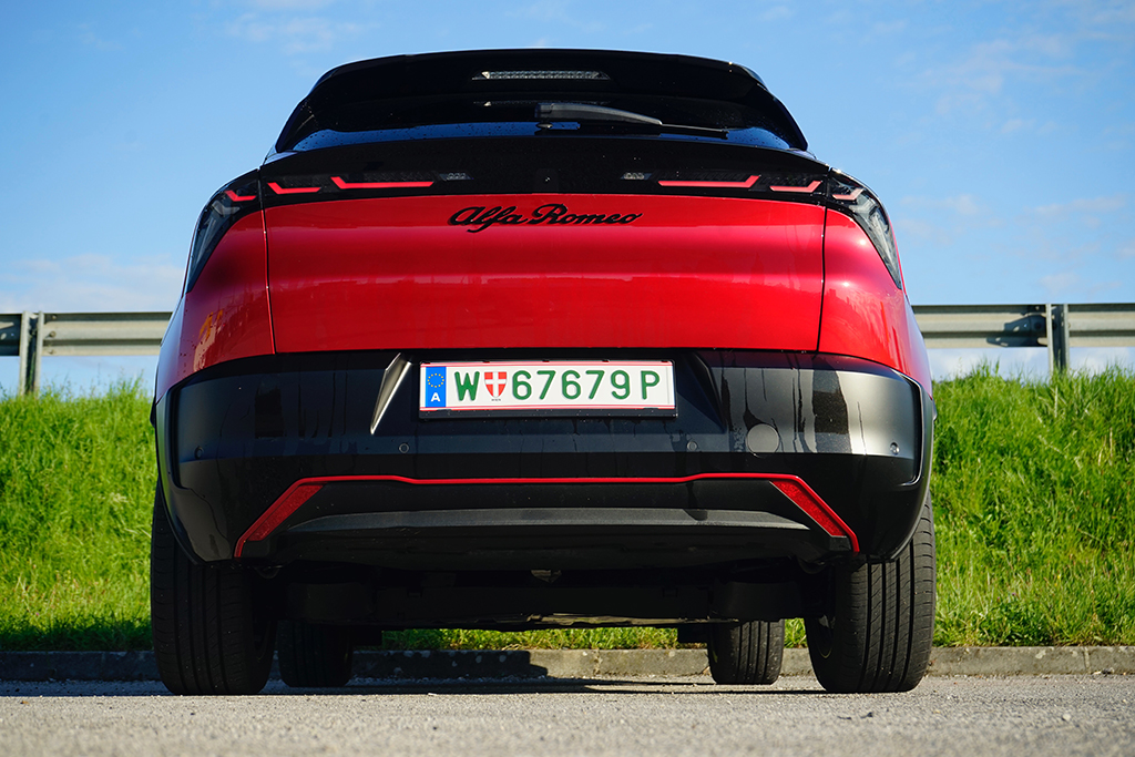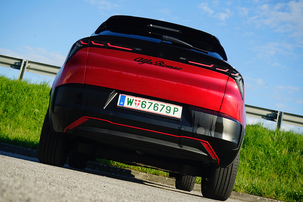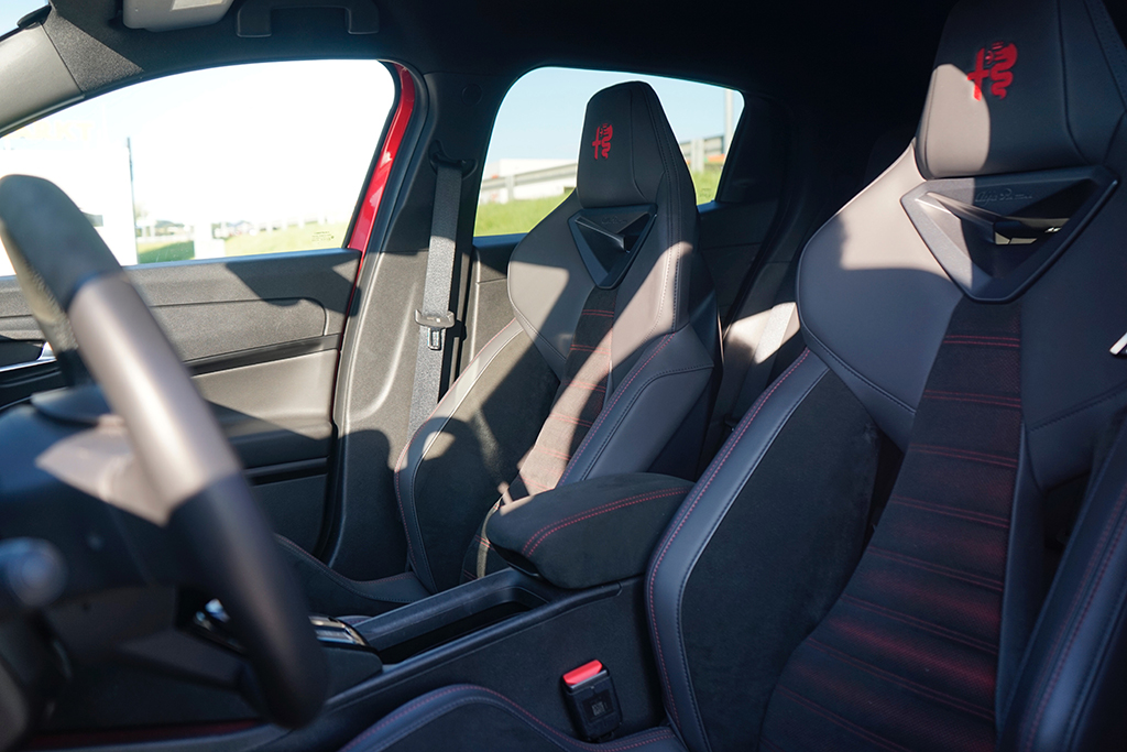 Wir öffnen die Tür und setzen uns auf die sportlich konturierten Premium-Sitze SPIGA. Im Innenraum trifft Eleganz auf Dynamik: Zwei großflächige Displays glänzen, das Kombiinstrument mit 10,25 Zoll, das zentrale Infotainment mit fast gleicher Größe, beide eingebettet in hochwertige Materialien mit „Rosso“-Akzenten und Carbon-Anmutung. Die Sitze tragen Stickereien, das Lederlenkrad ist griffig, akkurat abgestimmt. Serienmäßig finden wir im Interieur weiters eine Ambiente-Beleuchtung, Klimaautomatik, Sitzheizung vorne, Navigation, Abschaltautomatik und eine Rückfahrkamera mit 180°-Sicht – in Kombination ergibt sich ein Raum, der bis in die letzte Naht das Versprechen sportlicher Alltagstauglichkeit hält. Zusammengefasst: Vorne wirkt alles auf Fahrer fokussiert! Im Fond ist das Platzangebot überschaubar, dafür kompakt-athletisch – genau passend zur Philosophie des Fahrzeugs. Der Kofferraum bietet rund 400 Liter Ladevolumen und lässt sich einfach bis auf 1265 Liter erweitern, eine sensorgesteuerte Heckklappe und eine niedrige Ladekante erleichtern das Verstauen auch größerer Gepäckstücke.