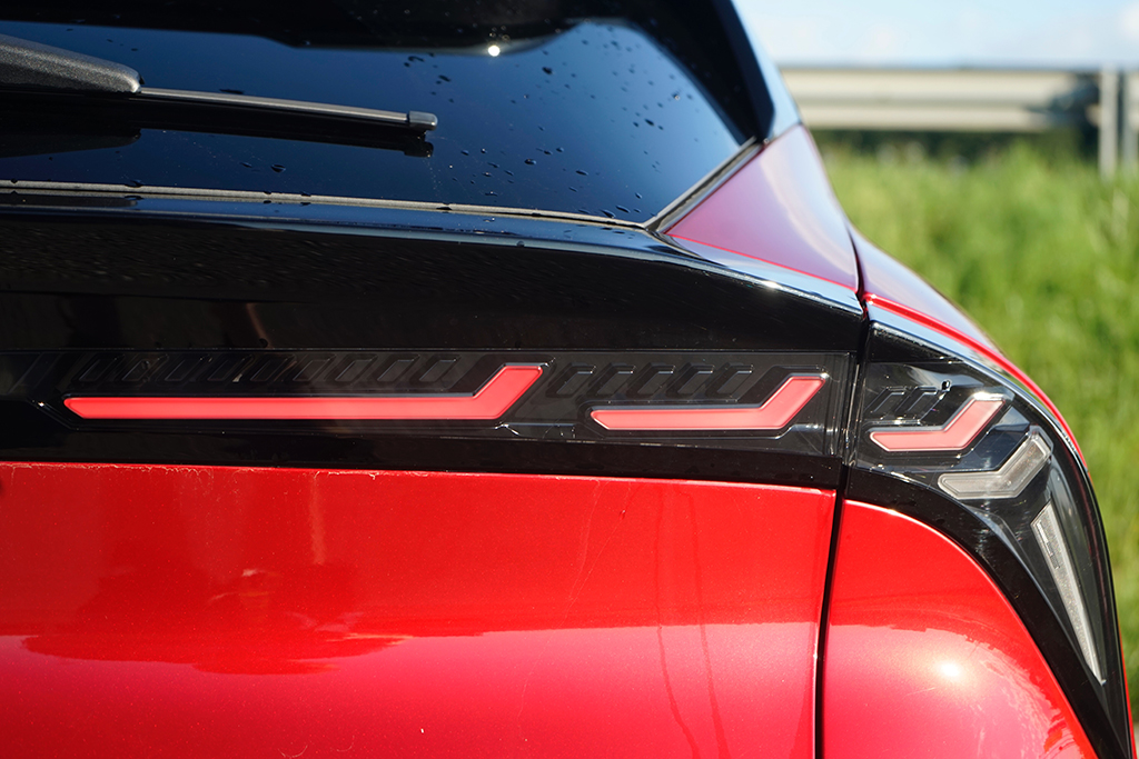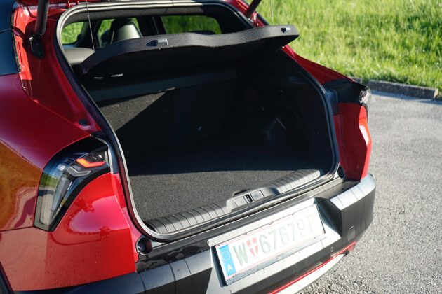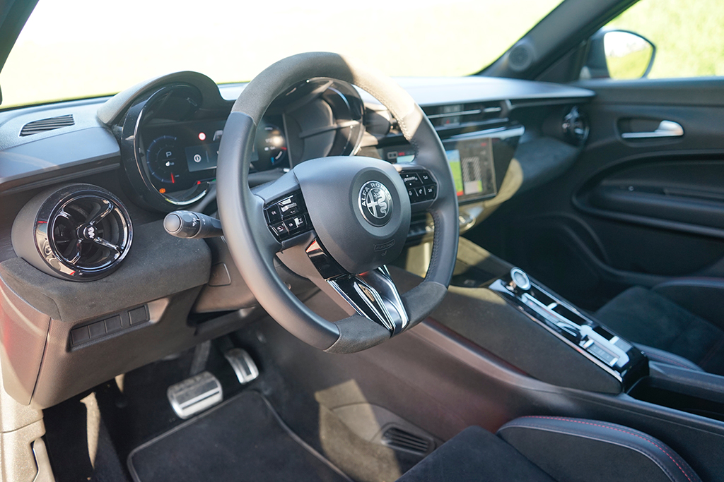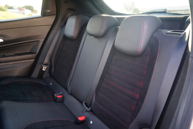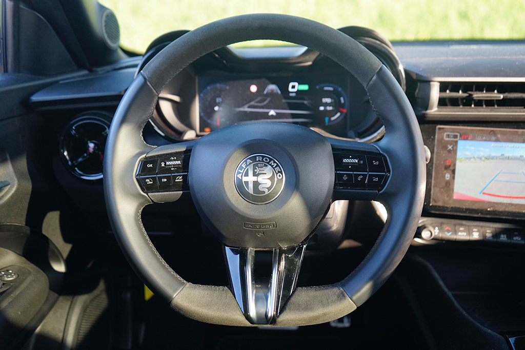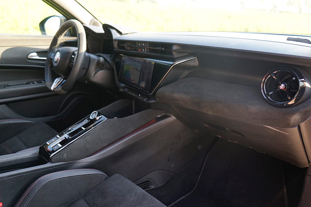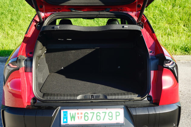 Wir öffnen die Tür und setzen uns auf die sportlich konturierten Premium-Sitze SPIGA. Im Innenraum trifft Eleganz auf Dynamik: Zwei großflächige Displays glänzen, das Kombiinstrument mit 10,25 Zoll, das zentrale Infotainment mit fast gleicher Größe, beide eingebettet in hochwertige Materialien mit „Rosso“-Akzenten und Carbon-Anmutung. Die Sitze tragen Stickereien, das Lederlenkrad ist griffig, akkurat abgestimmt. Serienmäßig finden wir im Interieur weiters eine Ambiente-Beleuchtung, Klimaautomatik, Sitzheizung vorne, Navigation, Abschaltautomatik und eine Rückfahrkamera mit 180°-Sicht – in Kombination ergibt sich ein Raum, der bis in die letzte Naht das Versprechen sportlicher Alltagstauglichkeit hält. Zusammengefasst: Vorne wirkt alles auf Fahrer fokussiert! Im Fond ist das Platzangebot überschaubar, dafür kompakt-athletisch – genau passend zur Philosophie des Fahrzeugs. Der Kofferraum bietet rund 400 Liter Ladevolumen und lässt sich einfach bis auf 1265 Liter erweitern, eine sensorgesteuerte Heckklappe und eine niedrige Ladekante erleichtern das Verstauen auch größerer Gepäckstücke.