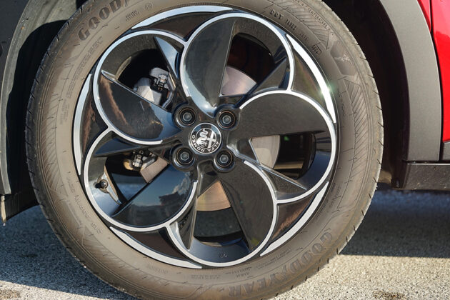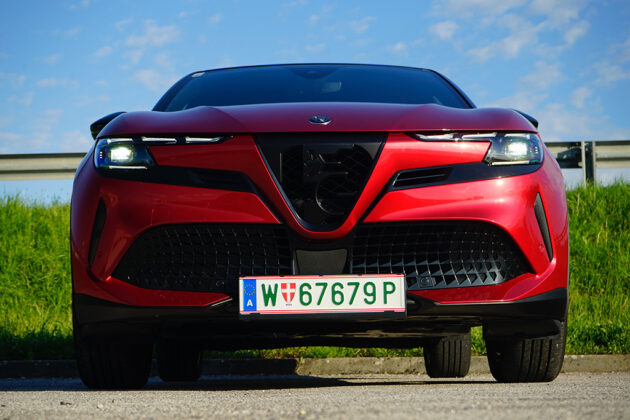 Im Antrieb steckt durchaus Sportlichkeit, obwohl wir uns in der schwächeren 115 kW / 156 PS Variante mit 260 Nm Drehmoment bewegen. Den Standardsprint von 0-100 km/h absolviert der Alfa in 8,9 Sekunden, die Vmax ist mit 150 km/h begrenzt. Es ist aber stets spürbar, dass Alfa Romeo nicht nur an das Fahren, sondern ans Fühlen denkt. Es stehen drei Fahrmodi von „Advanced Efficiency“, „Naturale“ bis „Dinamica“ zur Verfügung. Wir wählen den „sportlichsten“-Modus, das Lenkrad reagiert jetzt scharf, das Pedal „erwacht“ – und sofort spürt man: Der Junior Elettrica will keine Kompromisse eingehen.