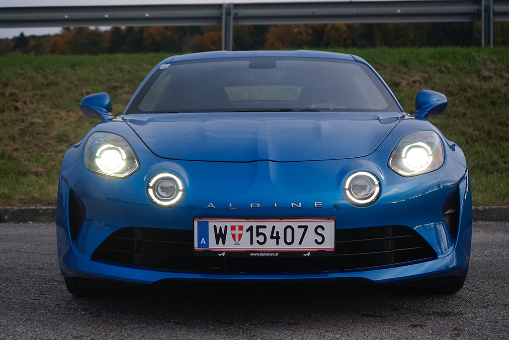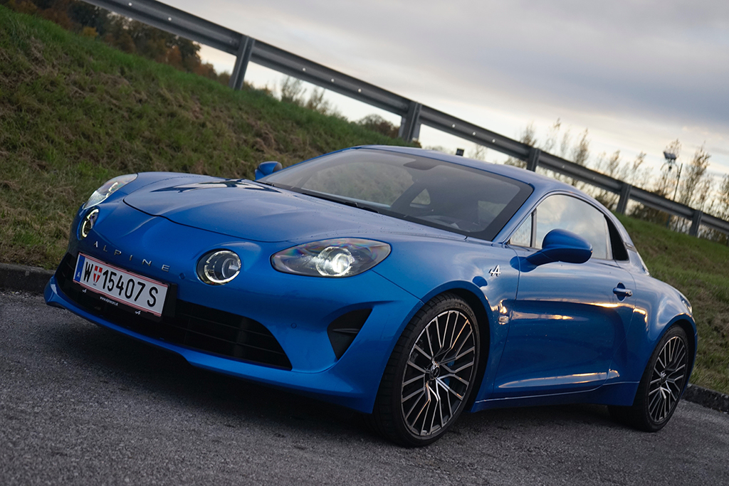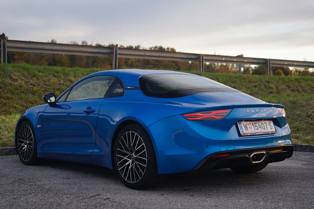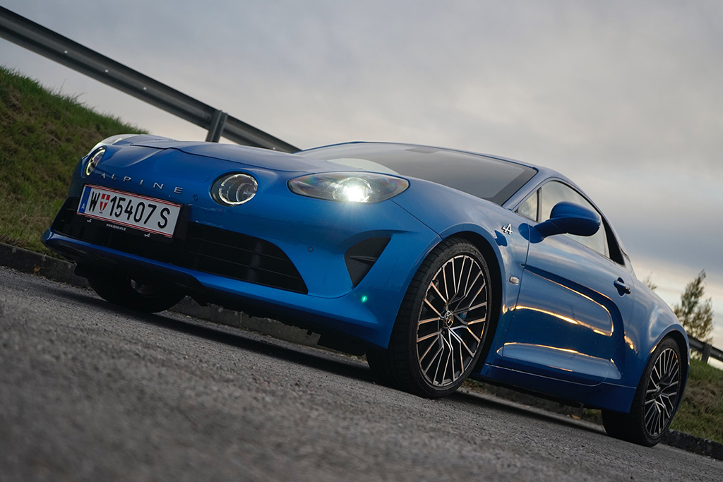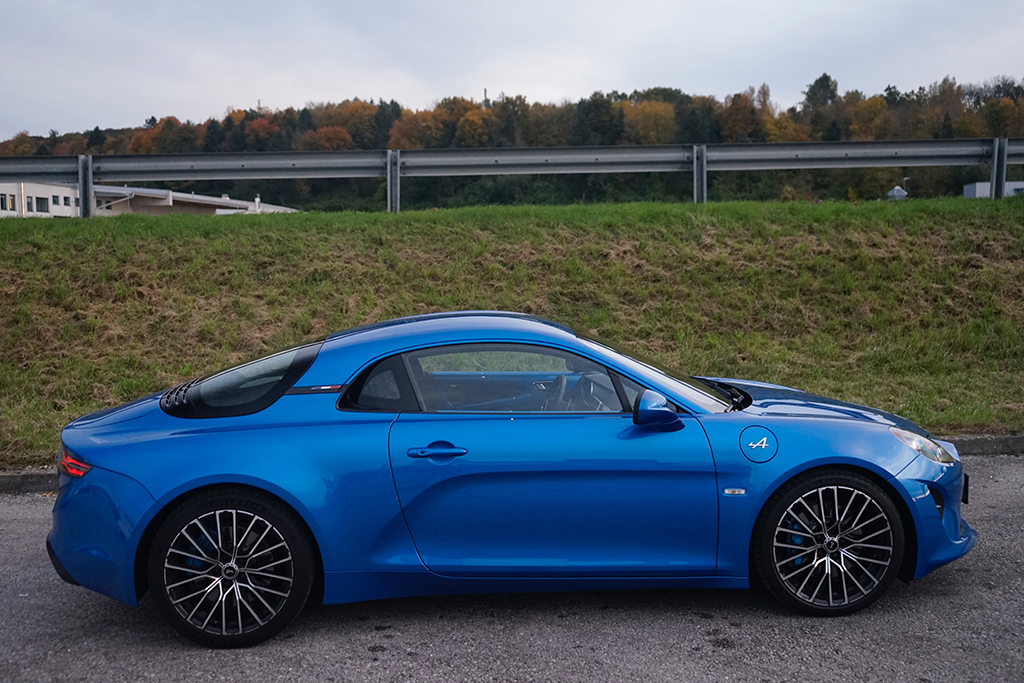 Wir gehen einmal um sie herum und können uns kaum sattsehen. Alpine-Blau, ein Farbton wie flüssiges Adrenalin, schimmert über den perfekt modellierten Rundungen. Die „4,18 m langen Proportionen“ sind fast schon klassisch: flach, breit, kompakt, kein übertriebener Spoiler, sondern klare Linien und Konzentration auf das Wesentliche. Das ist kein Auto, das aufdringlich wirken muss. Es flüstert: „Wenn du weißt, was du tust, wirst du mich verstehen.“