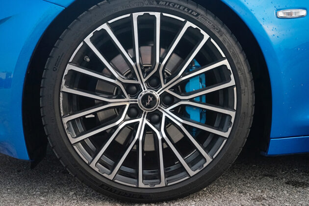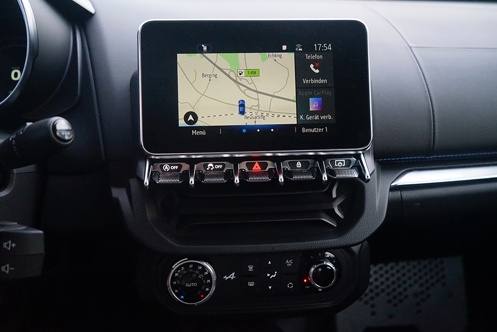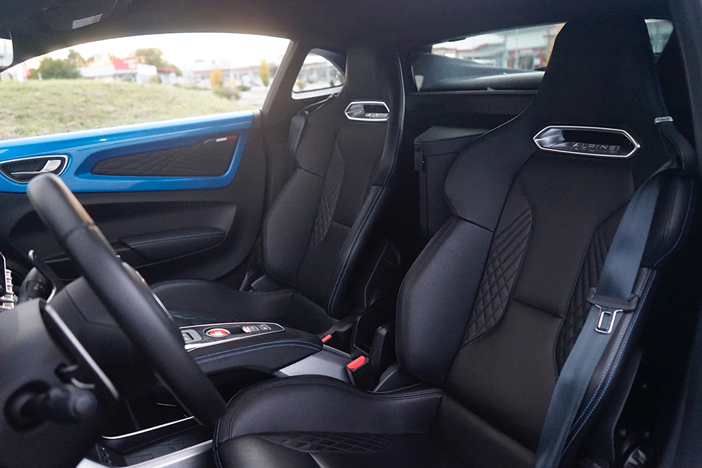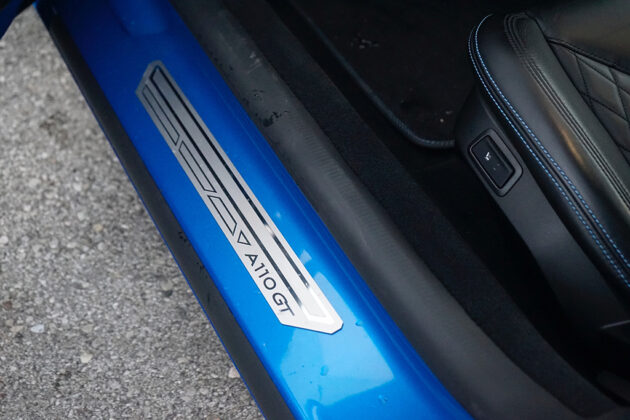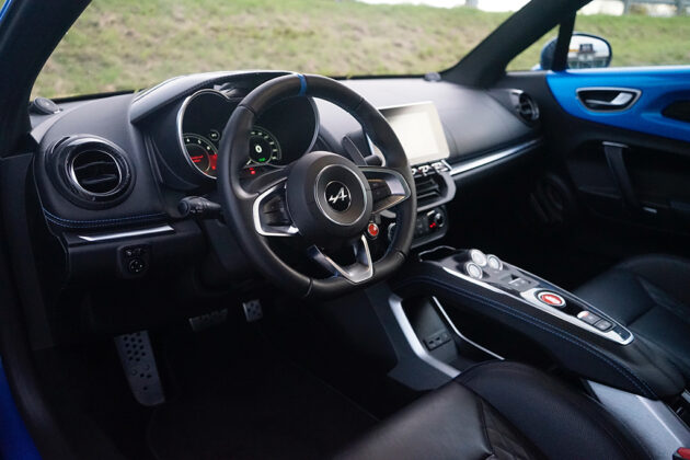 Wir öffnen die leichte Tür, setzen uns tief in die beheizbaren Ledersitze. Keine übertriebene Lounge, kein Ablenkungstheater. Aluminium-Pedale, kompakte Anzeigen, fein beledert, sauber vernäht – ein Cockpit, das uns nicht inszeniert, sondern einschließt. Alpine-Telemetrics wartet bereit, um uns Herzfrequenz und G-Kräfte zu zeigen, nicht Social-Media-WLAN. Die Fußstütze aus Aluminium, die Leder-Fußmatten mit Alpine-Logo, die filigrane Aluminium-Mittelkonsole mit sportlichem 7“ Touchscreen des Multimedia-System inklusive Focal-Premium Systems – alles spricht von Leidenschaft für Fahrer.