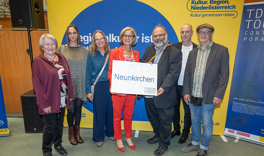 Landeshauptfrau Johanna Mikl-Leitner und NÖ Kulturvernetzung-Geschäftsführer Martin Vogg (2. von rechts) mit teilnehmenden Künstlerinnen und Künstlern der „Tage der offenen Ateliers“ aus Neunkirchen. Foto: © NLK Khittl