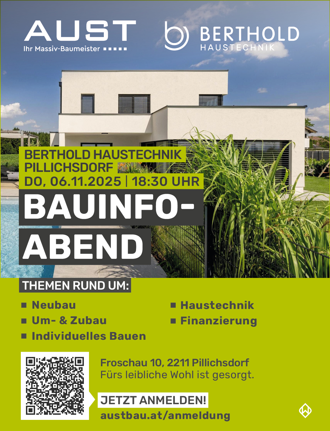 Am Donnerstag, 06. November 2025 findet der AUST-Bau Bauinfo-Abend in Pillichsdorf statt.