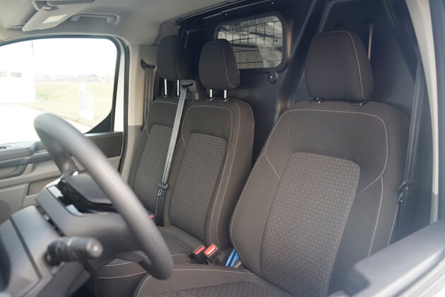 Im Innenraum des Ford Transit Custom Trend zeigt sich ebenfalls der pragmatische Ansatz des Fahrzeugs. Die Sitze sind mit einer Metalltrennwand vom Laderaum abgetrennt und bieten für den Fahrer und die Beifahrer einen soliden Komfort, auch auf längeren Strecken zeigt sich der Ford sehr komfortabel. Der Platz für drei Personen ist ausreichend, auch wenn der Fokus klar auf der Funktionalität liegt. Das Cockpit ist übersichtlich gestaltet und bietet eine einfache Bedienung. Mit dem Modellwechsel ist auch im Transit Custom serienmäßig das Ford SYNC 4 samt Audiosystem mit 13“ Multifunktionsdisplay und AppLink ins Cockpit „eingezogen“, die Integration von Smartphones funktioniert reibungslos und der Fahrkomfort durch Navigation, Musik und Kommunikation erreicht dabei höchstes PKW-Niveau. Für ein funktionales Nutzfahrzeug ist der Innenraum erstaunlich gut ausgestattet, ohne dabei in Luxus zu verfallen. Vielmehr geht es darum, den Insassen mit Features wie Klimaautomatik & Co. ein komfortables und praktisches Arbeitsumfeld zu bieten – dies ist hervorragend gelungen.