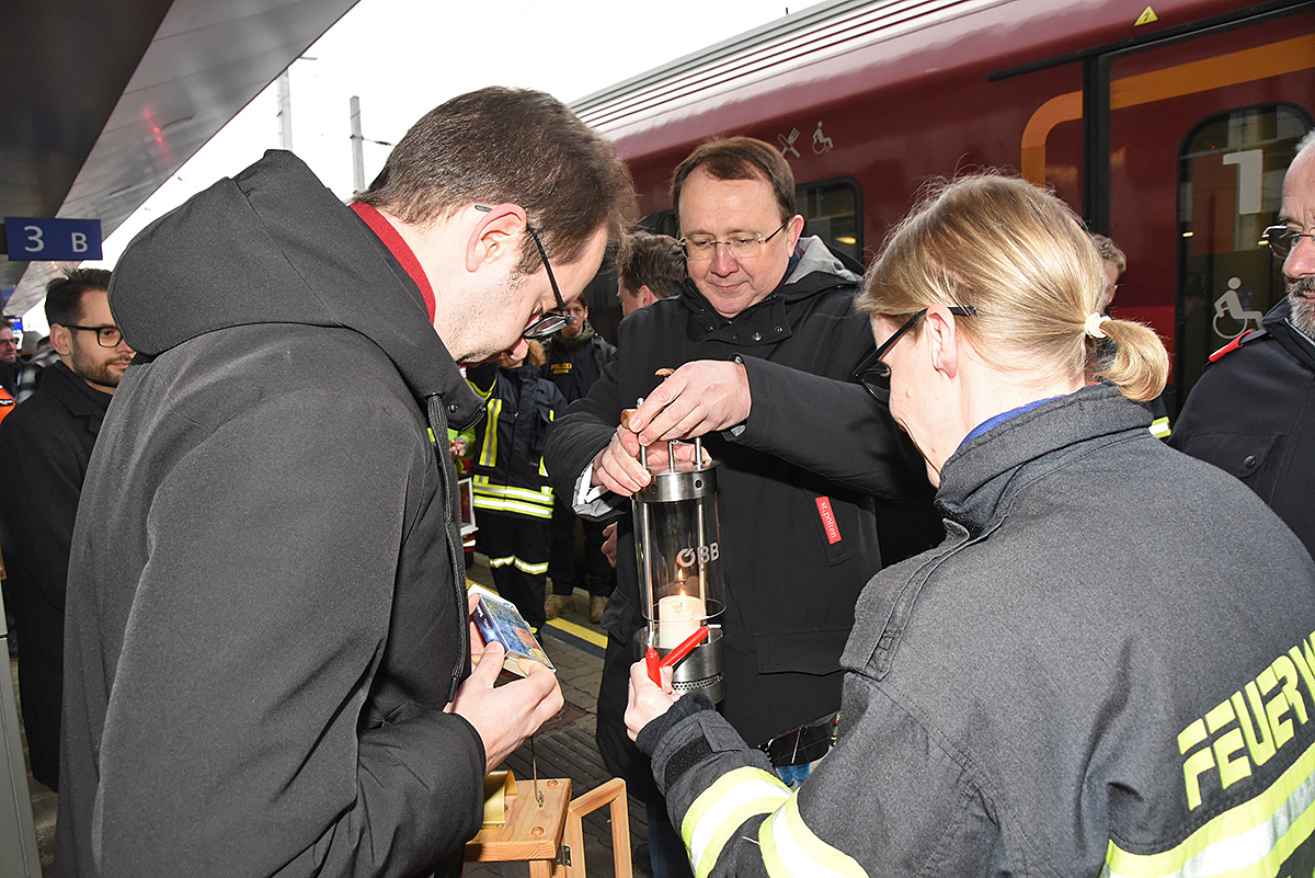 Die ÖBB überbrachte das Friedenslicht, welches direkt an Vertreter:innen der Blaulichtorganisationen verteilt wurde. Foto: © Josef Vorlaufer