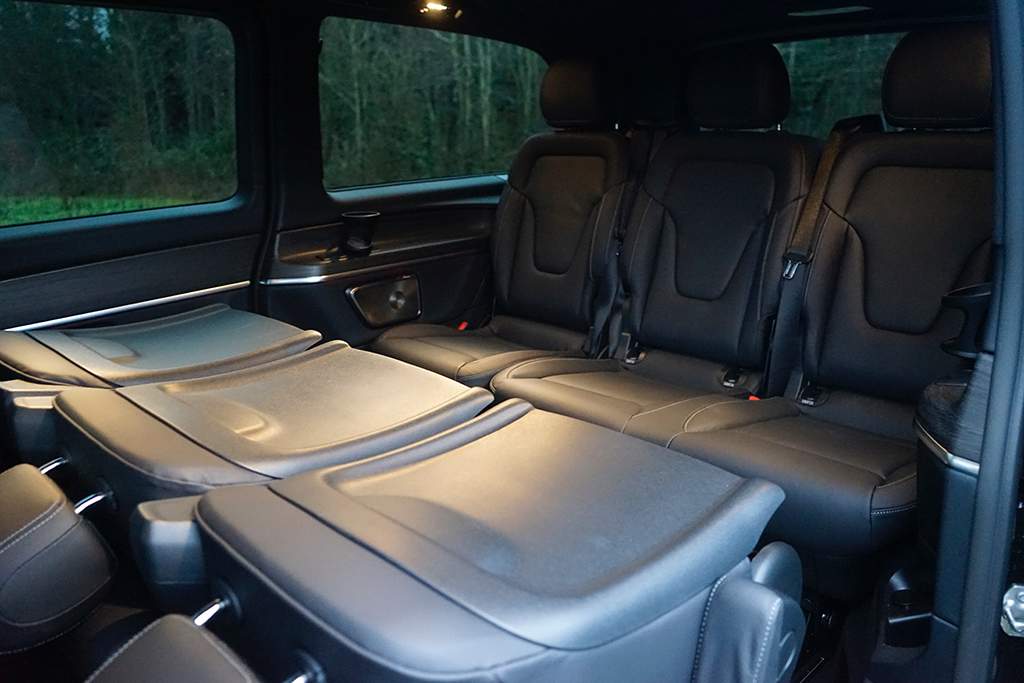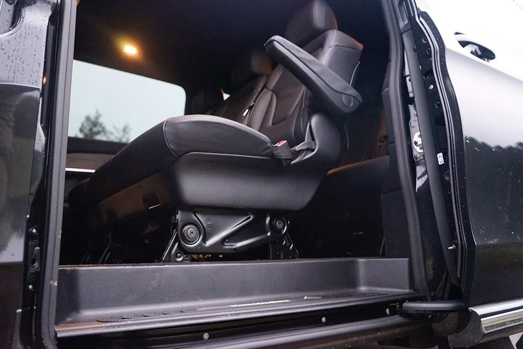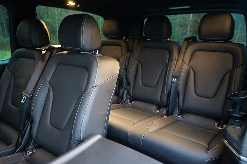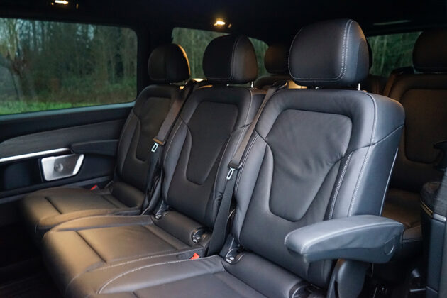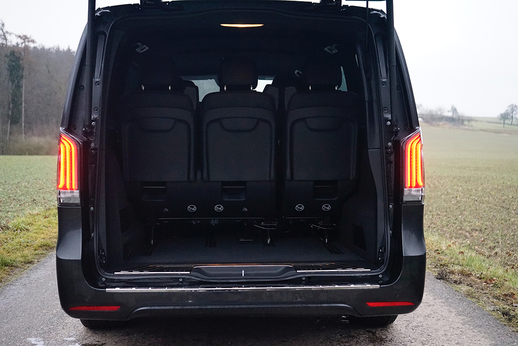 Schon beim Einsteigen – hinten via elektrischer Schiebetüren – spüren wir die außergewöhnlich hohe Qualitätsanmutung. Die Materialien fühlen sich „teuer“ an, die Oberflächen sind sauber verarbeitet und die gesamte Innenarchitektur wirkt stimmig und edel. Die acht Luxus-Einzelsitze sind großzügig dimensioniert, gut gepolstert und so angeordnet, dass auch in der dritten Reihe Erwachsene bequem reisen. Das Raumgefühl ist beeindruckend, selbst voll besetzt bleibt der EQV luftig und entspannt. Besonders die Ambientebeleuchtung setzt emotionale Akzente und verwandelt den Innenraum bei Dunkelheit in einen stilvollen, fast schon luxuriösen Reiseraum, der lange Etappen spürbar angenehmer macht. Im Heck wartet zudem ein riesiger Stauraum und Features wie die separat öffnende Heckscheibe gehören bei Mercedes-Benz sowieso zum „guten Ton“.