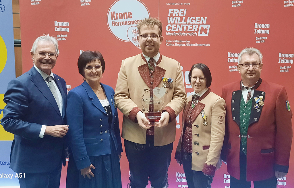 Stift Zwettl, Yspertal, St. Pölten – Im würdigen Ambiente des Landhauses in St. Pölten wurde Dominik Ebner, Bed bei der Aktion „Krone Herzensmenschen“ – in Kooperation mit dem Freiwilligencenter Niederösterreich, einer Initiative der Kultur.Region.Niederösterreich am 7. November 2025 ausgezeichnet. Ausschlaggebend war sein ehrenamtlicher und überzeugter Einsatz rund um das Schulorchester der HLUW Yspertal und die von ihm initiierten Benefizkonzerte zugunsten der St. Anna Kinderkrebshilfe.