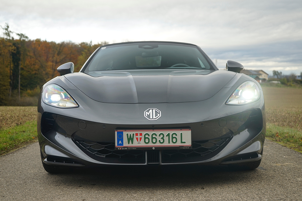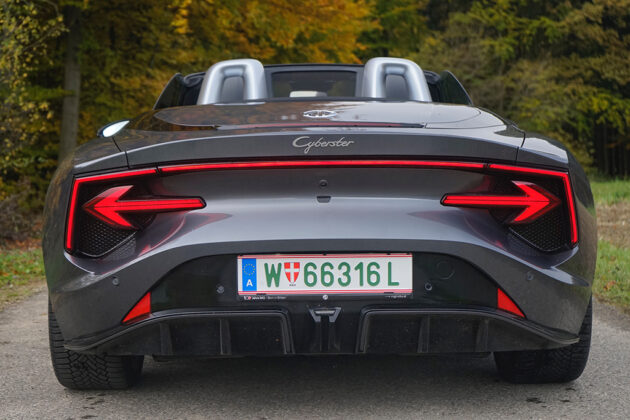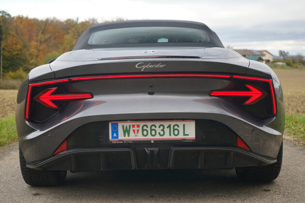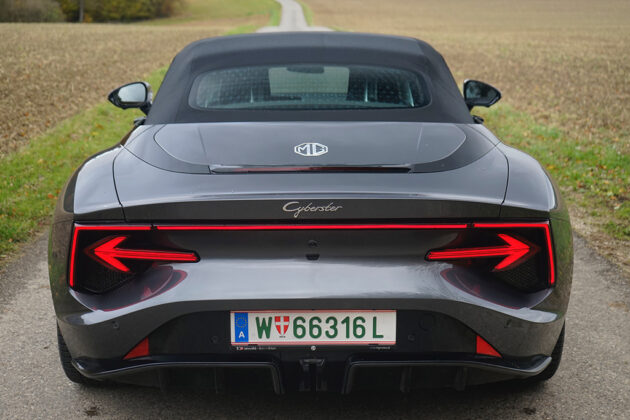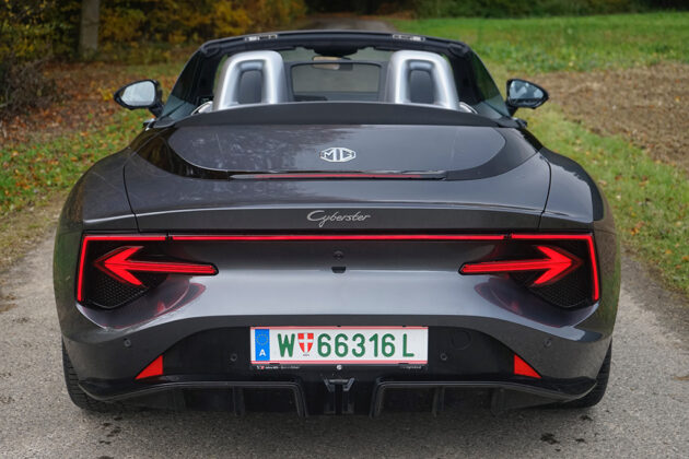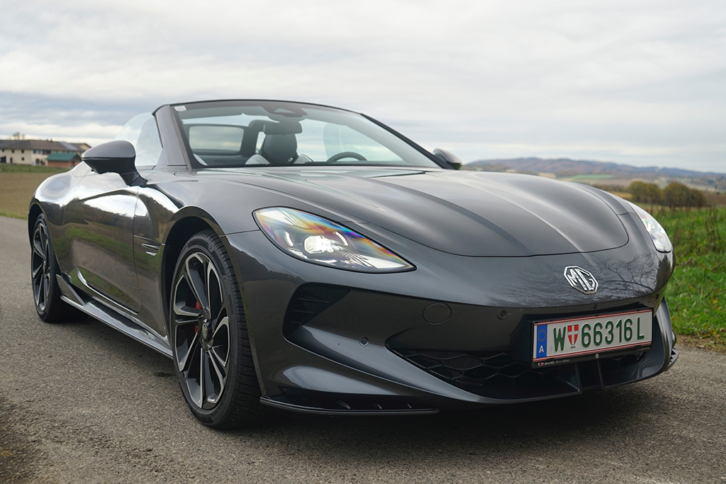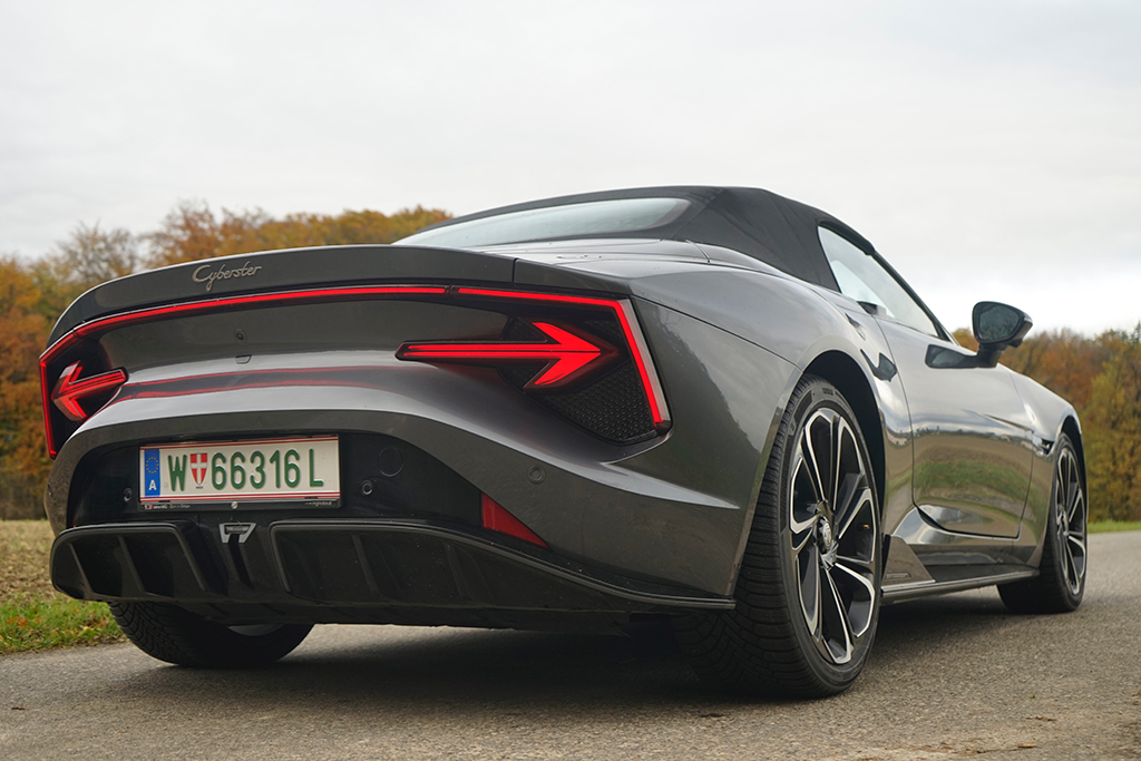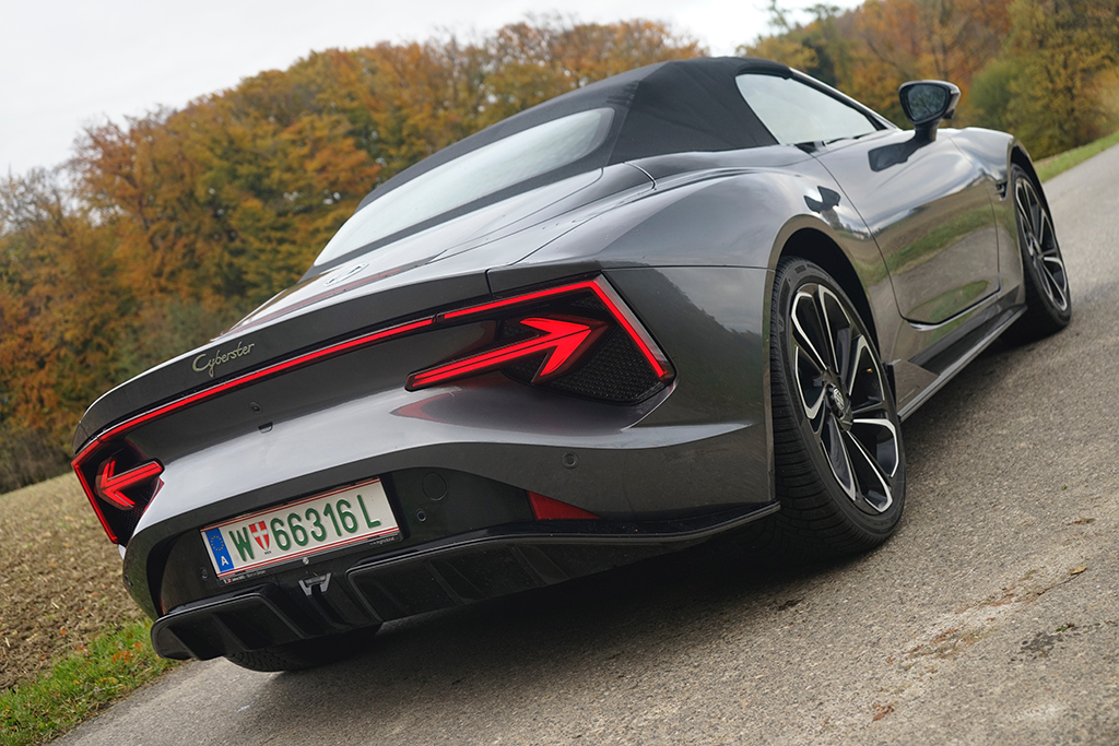Schon die ersten Sekunden vermitteln dieses ganz besondere Roadster-Gefühl, das man sonst nur aus einer anderen automobilen Epoche kennt. Der MG Cyberster GT spielt mit seinen Proportionen – der langen Haube, dem knappen Heck, der extrem niedrigen Silhouette – ein Design, das auf den ersten Blick mehr Concept Car als Serienmodell wirkt. Mit 4,54 Metern Länge und über 1,90 Metern Breite steht der Wagen satt auf der Straße, und die serienmäßigen 20-Zoll-Räder unterstreichen den Auftritt eines echten Feschaks. Sobald das elektrisch arbeitende Softtop nach hinten faltet und sauber im Heck verschwindet, öffnet sich nicht nur ein Dach, sondern eine Stimmung, die wir sonst im Elektrozeitalter nie erleben.