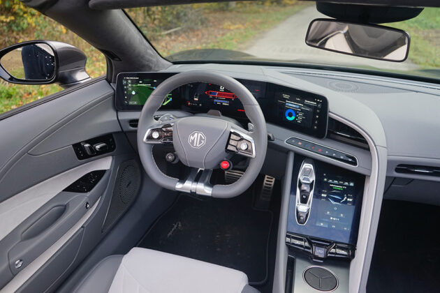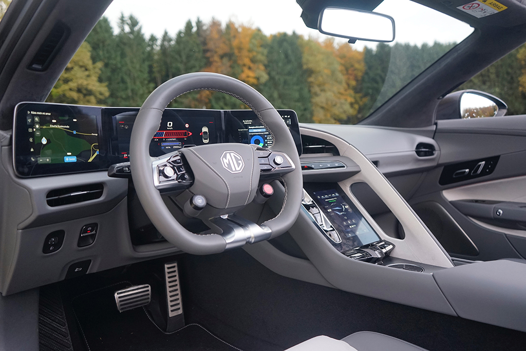 Im Innenraum geht es futuristisch weiter. Die immersive, geschwungene 3-teilige Displaylandschaft umschließt uns fast wie ein Cockpit im Gaming-Look, ohne dabei unübersichtlich zu wirken: Der aufrechte 7-Zoll-Touchscreen in der Mittelkonsole übernimmt Klima und Fahrzeugfunktionen, während die dreiteilige 10,25-Zoll Instrumentenanzeige klar gegliedert bleibt, ein weiterer 7-Zoll Touchscreen agiert als Zentrum des Infotainments. Die Serienausstattung des GT umfasst bereits ab Werk elektrisch verstellbare Sportsitze samt Memoryfunktion, Bose-Soundsystem, umfangreiche Assistenzsysteme, Navigationssystem, Smartphone-Integration, beheizbares Lenkrad etc. Die Sportsitze sind straff, tief eingebaut und geben uns sofort das Gefühl, IM Auto zu sitzen und nicht bloß darauf. Dieses Cockpit ist keine Hommage an klassische Roadster, sondern eine moderne Bühne – und genau das harmoniert erstaunlich gut mit dem offenen Charakter.