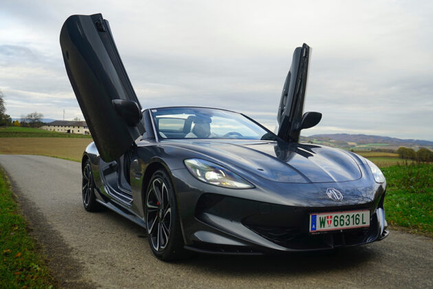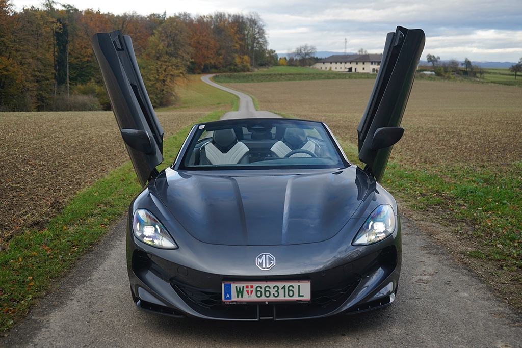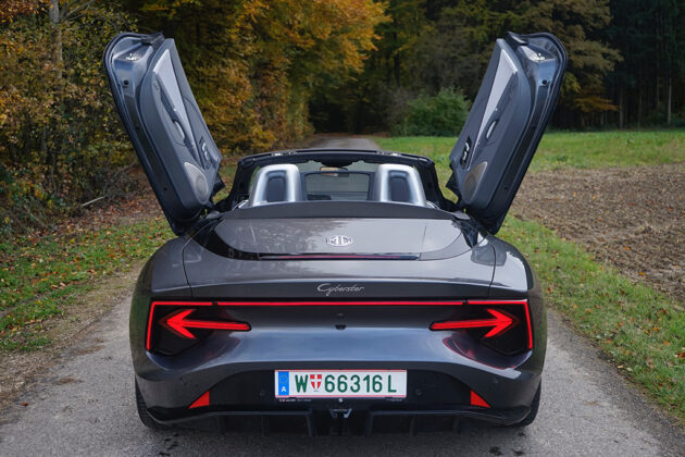 Fazit: Der MG Cyberster GT ist ein elektrischer Roadster, der uns mit seinem Design, seinen famosen Fahrleistungen und seinem offenen Charakter unmittelbar packt. Das elektrisch nach hinten faltende Stoffverdeck, die Scherentüren und die kraftvolle Beschleunigung machen ihn zu einem echten Erlebnis wie es sonst nur Supersportwagen bieten. Der fehlende Motorsound bleibt die einzige nostalgische Lücke, doch alles andere liefert pure Fahrfreude. Ein moderner, mutiger, fesch auftretender Roadster -Sportwagen, der beweist, dass Leidenschaft auch elektrisch entstehen kann. Der günstige Preis überrascht obendrein: der Cyberster steht ab 59.490 Euro in den Verkaufslisten! Dieser MG fährt in einer eigenen Liga – konkurrenzlos am derzeitigen Automobilmarkt!