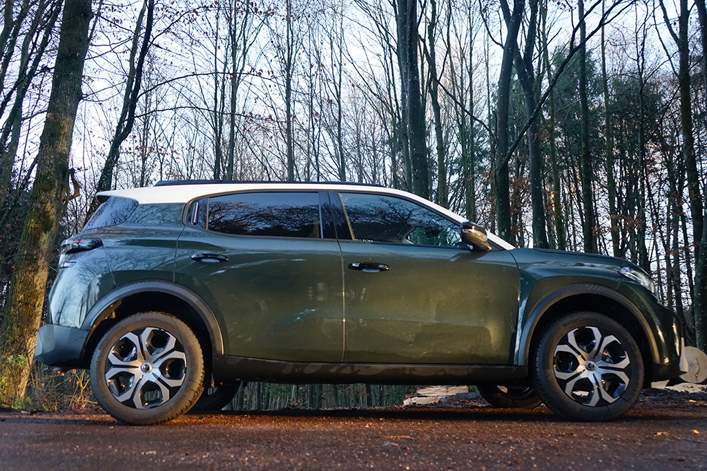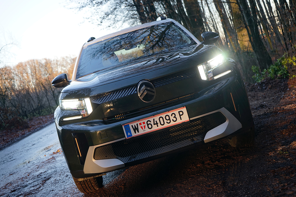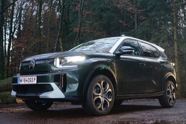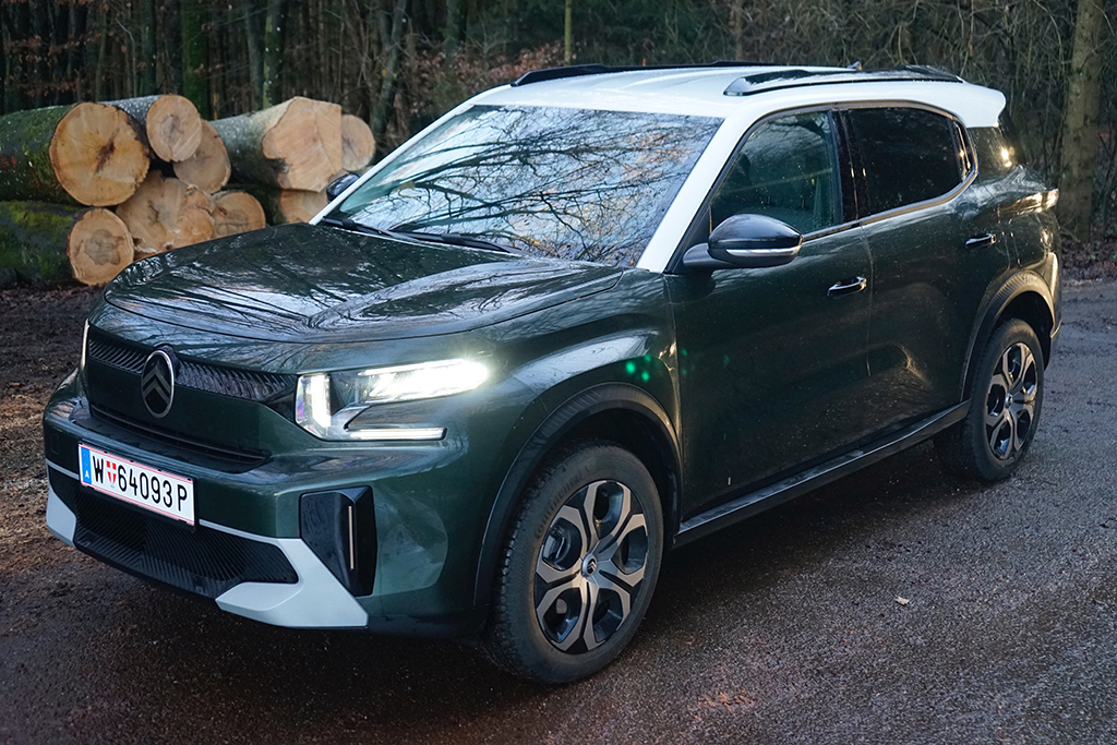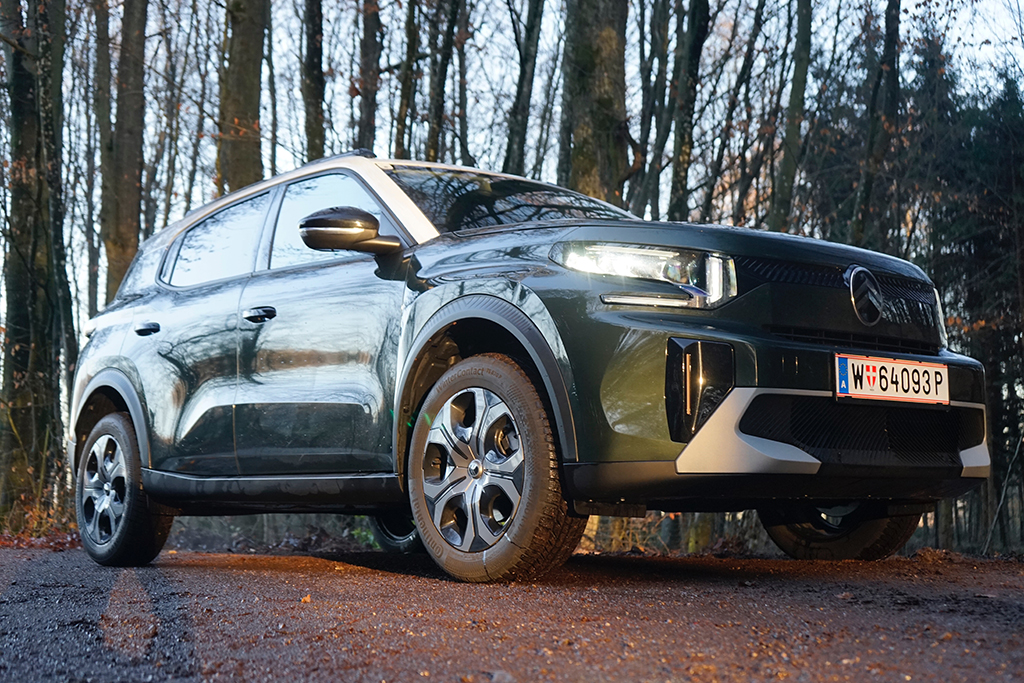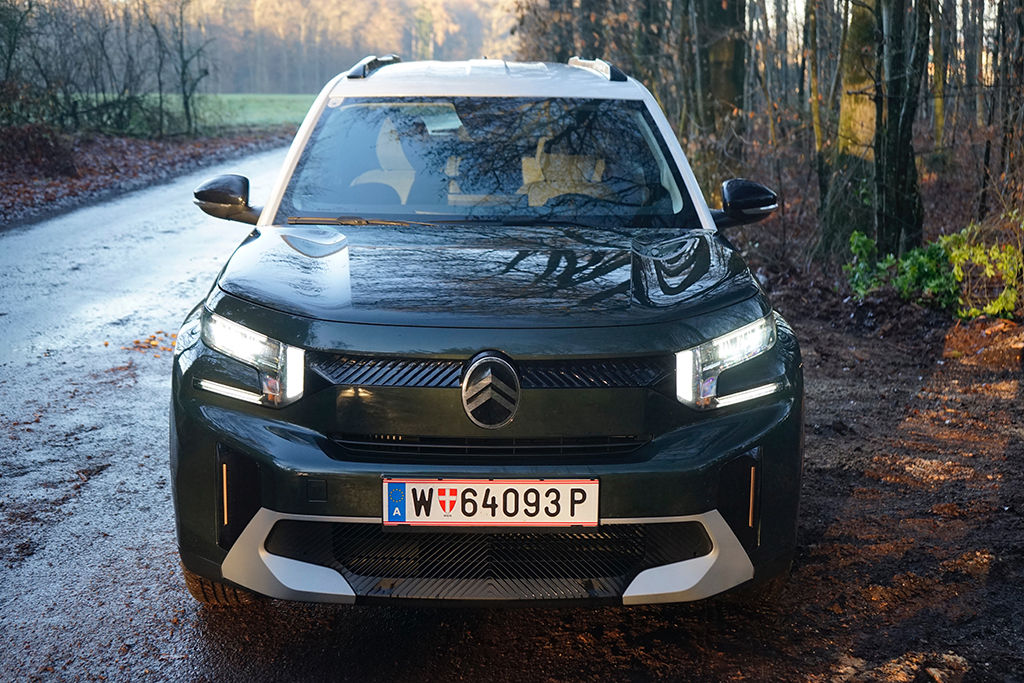 Der 4,40 m lange Citroën C3 Aircross ist kein typischer Kompakt-SUV, er ist ein urbaner Charakterkopf mit viel französischem Esprit – und genau das spüren wir vom ersten Moment an. Unser Testwagen in der kräftigen Montana grünen Lackierung wirkt frisch, selbstbewusst und angenehm unkonventionell. Die kantige Front mit den markanten LED-Leuchten, das hohe Dach und die klar gezeichneten Flächen verleihen dem Aircross einen sympathischen Auftritt, der sich deutlich von der oft uniformen Konkurrenz abhebt. Hier steht kein anonymes Stadt-SUV vor uns, sondern ein Auto mit Persönlichkeit, das Farbe bekennt – im wahrsten Sinn des Wortes.