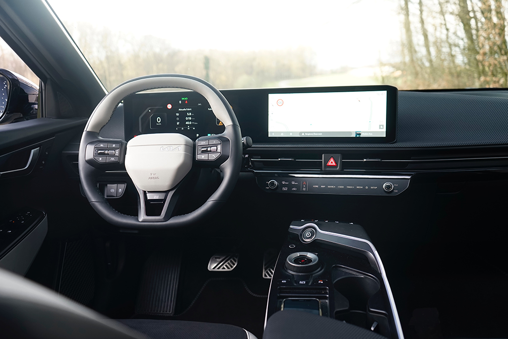 Auch im Interieur erwartet uns ein echter Technologieträger. Die GT-line Premium-Version fährt mit Veloursleder, Sportsitzen mit integrierten Kopfstützen, Ambientebeleuchtung und einem großzügigen Panorama-Display-Cockpit vor. Das „nachhaltige“ Interieur präsentiert sich nochmals wertiger, Klavierlackoberflächen sind nun angerauten, matten Oberflächen gewichen. Und das neue Design des doppelt abgeflachten Sportlederlenkrades gefällt uns nicht nur, das Volant liegt perfekt in Händen. Insgesamt wirkt der Innenraum aufgeräumt, stilvoll und hochwertig. Zentral angeordnet finden wir zwei 12,3-Zoll-Bildschirme, die sich zu einem breiten curved-digitalen Armaturenbrett verbinden. Die Darstellung ist gestochen scharf, die Menüs logisch aufgebaut, und die Touch- und Sprachbedienung funktioniert zuverlässig. Hinzu kommt eine separate Klima-Bedienleiste mit Sensortasten, die sich per Fingertipp von Temperaturregelung zu Infotainment-Kurzmenü umschalten lässt – clever gelöst. Gerade diese Doppelfunktion wurde früher kritisiert, heute finden wir dieses Technik-Feature genial.