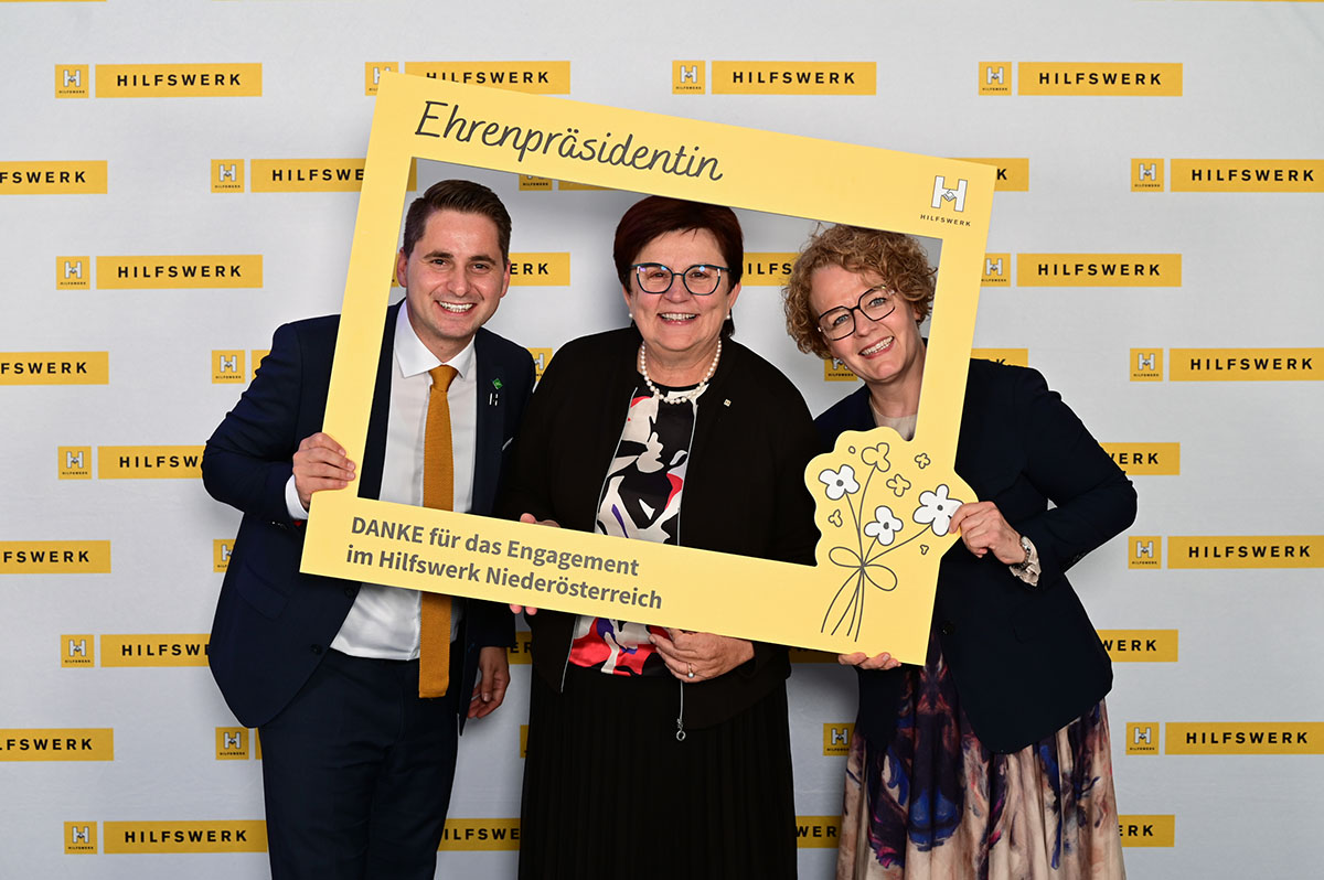 Michaela Hinterholzer wird zur Ehrenpräsidentin des Hilfswerk NÖ ernannt. v.l.n.r. Präsident des Hilfswerk NÖ Lukas Brandweiner, Ehrenpräsidentin Michaela Hinterholzer, Landesrätin Christiane Teschl-Hofmeister. © Hilfswerk Niederösterreich / Rudolf Schmied