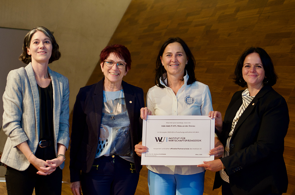 Das Schulzentrum Ybbs, Modellschule für Individualisierung und Potentialentfaltung, vertreten durch Schulleiterin Mag. Gerlinde Weinstabl, Mag. Elke Stadler und Mag. Barbara Mittmasser, freut sich über die feierliche Übergabe der Urkunde zur Partnerschule des Wirtschaftspädagogik Instituts der Wirtschaftsuniversität (WU) Wien.