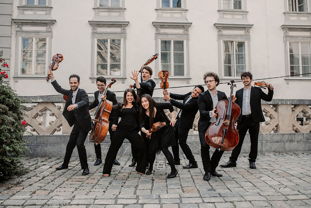 Am 25. Oktober darf sich das Publikum bei „Echo im Schloss. Oktettklänge von Haydn bis Piazzolla“ im freskengeschmückten Maria-Theresiensaal von Schloss Mannersdorf auf ein außergewöhnliches Hörerlebnis mit Werken der Klassik und Romantik bis hin zu feurigen Tangomelodien freuen — interpretiert durch das Grazer Oberton String Octet, eine der aufregendsten jungen Kammermusikformationen des Landes. Foto: © Marija Jancic/Haydnregion Niederösterreich