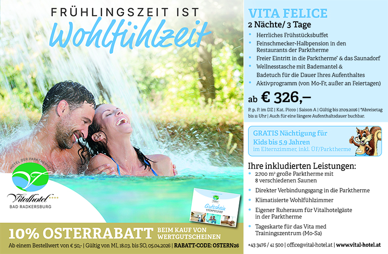 Das ****Vitalhotel der Parktherme Bad Radkersburg, im Süden der Steiermark, bietet seinen Gästen alles, was einen unvergesslichen Aufenthalt ausmacht: ein herrliches Sekt-Frühstücksbuffet mit einer Auswahl aus über 150 Speisen und Getränken, den direkten Verbindungsgang zur angeschlossenen Parktherme mit weitläufigem Saunadorf, eine hauseigene Wellnessabteilung, kulinarischen Genuss im Rahmen der Halbpension, eine gemütliche Lobby zum Verweilen, klimatisierte Wohlfühlzimmer, echte Gastfreundschaft sowie puren Genuss und Entspannung. Egal, ob Sie allein, zu zweit oder mit der ganzen Familie anreisen – das Vitalhotel begeistert mit vielfältigen Angeboten und seiner einmaligen Lage direkt an der Parktherme.