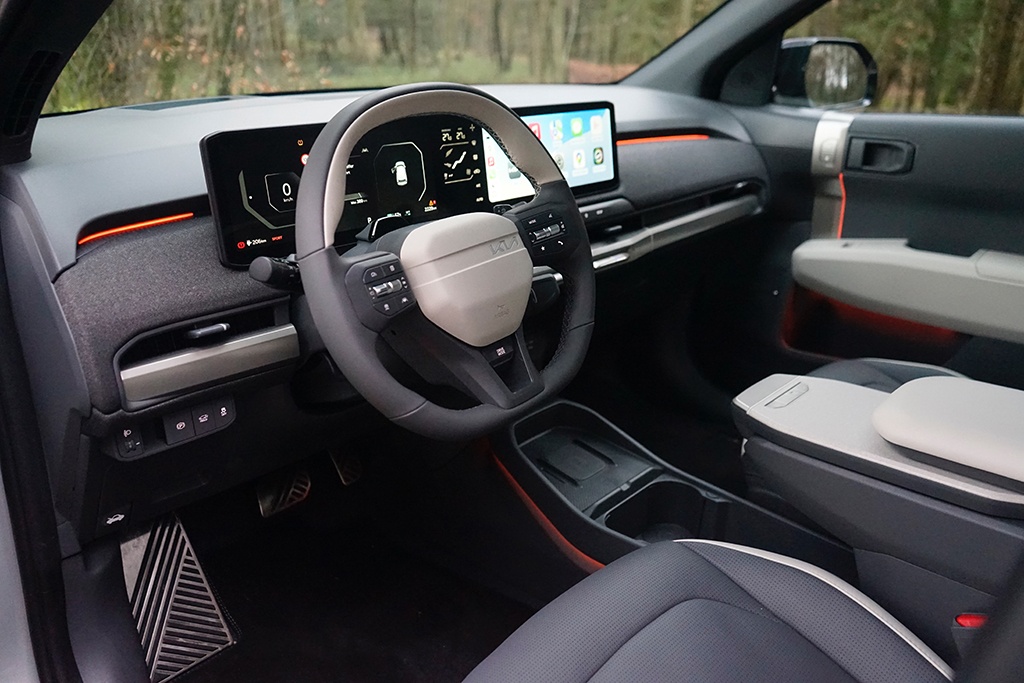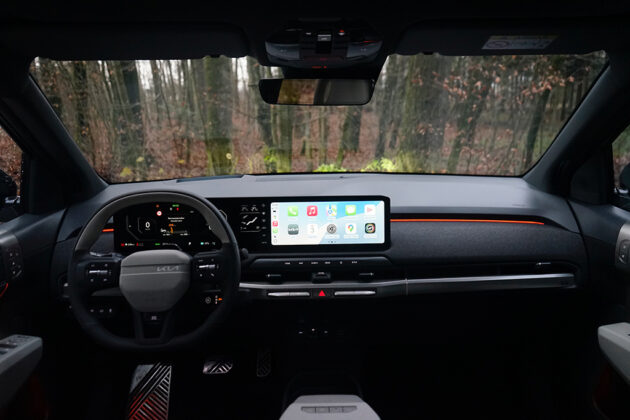 Im Innenraum zeigt der EV3, wie modern Kia inzwischen denkt. Die GT-line bringt ein großes, breites Dreifach-Panoramadisplay, das das digitale 12,3“ Supervision Cluster, das 12,3“ Rheostat-Display und das zentrale 12,3“ Touchscreen optisch zu einer Einheit verschmilzt. Die Darstellung ist klar, die Bedienung logisch aufgebaut und schnell erlernbar. Die Sitze sind sportlich geformt, bieten guten Seitenhalt und bleiben auch auf längeren Strecken sehr bequem. Materialien und Verarbeitung wirken überraschend hochwertig, die Mischung aus modernen Oberflächen, klaren Linien und funktionalen Details gibt dem Innenraum einen sehr zeitgemäßen, fast futuristischen Charakter.
