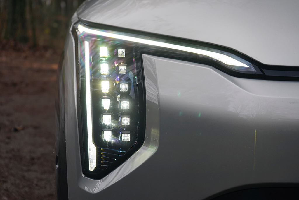 Der EV3 GT -line ist 4,31 Meter lang und verbindet kompakte Abmessungen mit einem selbstbewussten Auftritt. Schon optisch setzt er sich klar vom automobilen Einheitsbrei ab. Typisch Kia ist die bewusst eigenwillige, fast ein wenig abnorme Formensprache mit klaren Kanten, kräftigen Flächen und einer Front mit Star-Map-Beleuchtungskonzept, die man sofort wiedererkennt. Er sieht seinem großen Bruder EV9 erstaunlich ähnlich, wirkt dabei aber handlicher, urbaner und deutlich verspielter. Die sportlich gestalteten Stoßfänger, schwarze Akzente und die 19-Zoll-Leichtmetallräder der GT-line unterstreichen diesen Charakter und geben dem kleinen SUV ordentlich Attitüde.